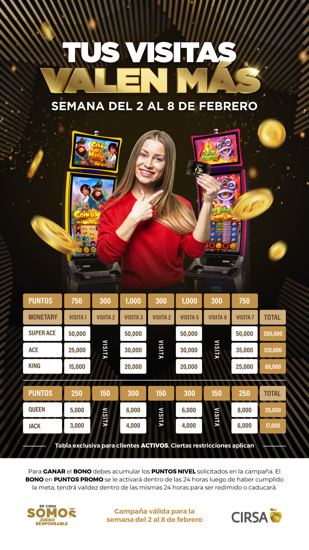 CIRSA promueve una actitud responsable hacia el juego, prohibiendo el acceso a menores de 18 años y facilitando todas las medidas y consejos necesarios para garantizar que el juego sea diversión y entretenimiento. Asimismo, trabajamos para generar una cultura de prevención que cree conciencia alrededor de los posibles trastornos del juego. El ‘jugador responsable’ es aquel que participa de una actividad de ocio de forma racional y sensata, siendo consciente de sus circunstancias individuales. Si es seguro es nuestro juego. En CIRSA Somos Juego Responsable.
